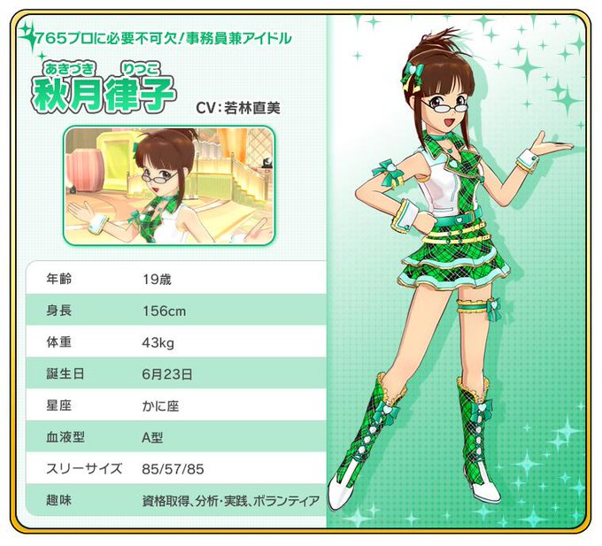 秋月律子 live-秋月律子(秋月律子(あきづき りつこ))是《偶像大师》系列作品中的人物。 是一位冷静沉着思考清晰的眼镜娘。 年龄:19岁 性格:有胆识 形象颜色:绿 生日:6月23日 身高:156cm 体重:43kg 3围: 血型:A型 爱好:考资格证,分析&实践 冷静沈著思考清晰的眼镜娘。 秋月 律子(あきづき りつこ) CV 若林 直美 (わかばやし なおみ) 年齢 19歳 誕生日 6月23日 身長 156cm 体重 43kg スリーサイズ 血液型 A型 趣味 資格取得 特技 分析・実践 好み ゲーム、小説 秋月律子です! アイドルやるからにはキッチリ計画